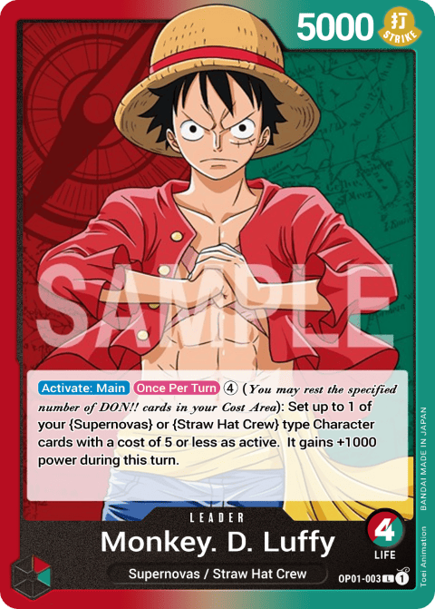 Detalles de la carta Rareza: L Numero: OP01-001 Color: Rojo Tipo de carta: Lider
